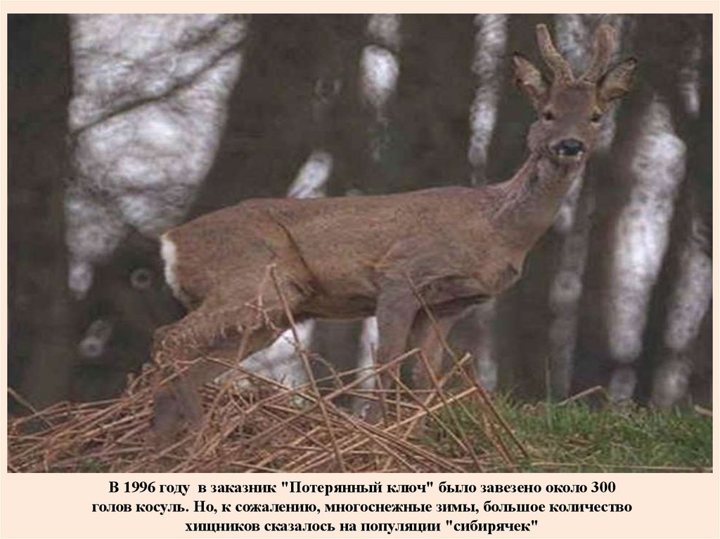 В 1996 году в заказник "Потерянный ключ" было завезено около 300голов косуль. Но, к сожалению, многоснежные зимы, большое количество