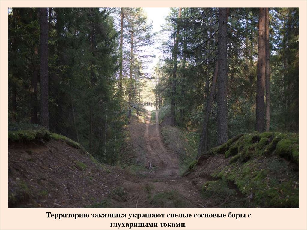 Территорию заказника украшают спелые сосновые боры сглухариными токами.