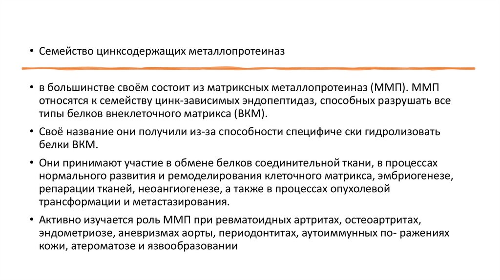 • Семейство цинксодержащих металлопротеиназ• в большинстве своём состоит из матриксных металлопротеиназ (ММП). ММП