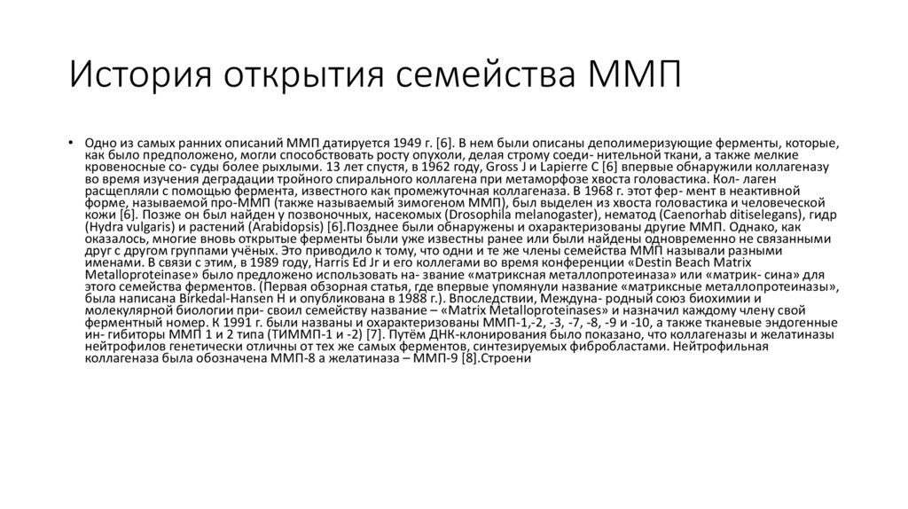 История открытия семейства ММП• Одно из самых ранних описаний ММП датируется 1949 г. [6]. В нем были описаны деполимеризующие ферменты, которые,