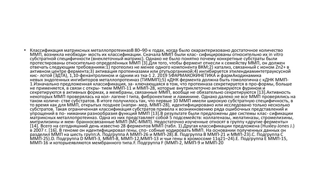 невых эндогенных ингибиторов металлопротеиназ (ТИММП);5) кДНК фермента должна быть гомологична с кДНК MMП1.Изначально предложенная классификация, за- ключающаяся в том, что протеиназа секретируется в про-формы, больше