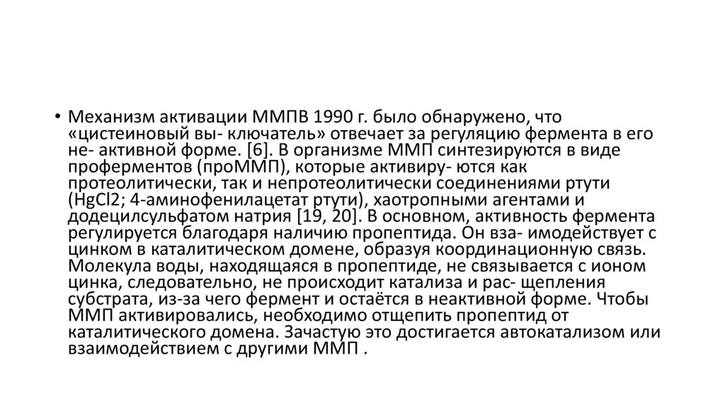 • Механизм активации ММПВ 1990 г. было обнаружено, что«цистеиновый вы- ключатель» отвечает за регуляцию фермента в его