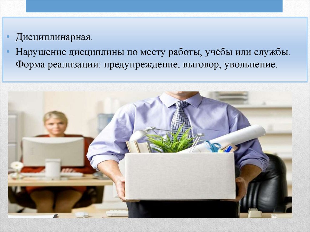 • Дисциплинарная.• Нарушение дисциплины по месту работы, учёбы или службы.