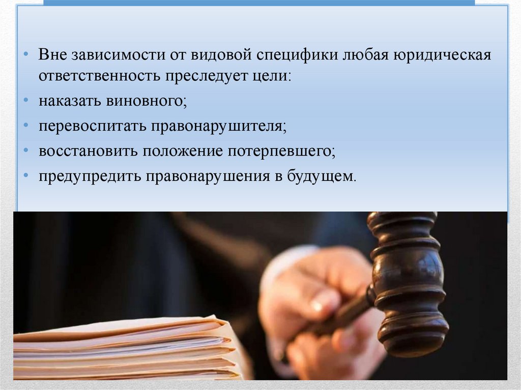 • Вне зависимости от видовой специфики любая юридическаяответственность преследует цели: