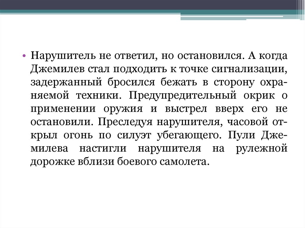 остановили. Преследуя нарушителя, часовой открыл огонь по силуэт убегающего. Пули Джемилева настигли нарушителя на рулежной