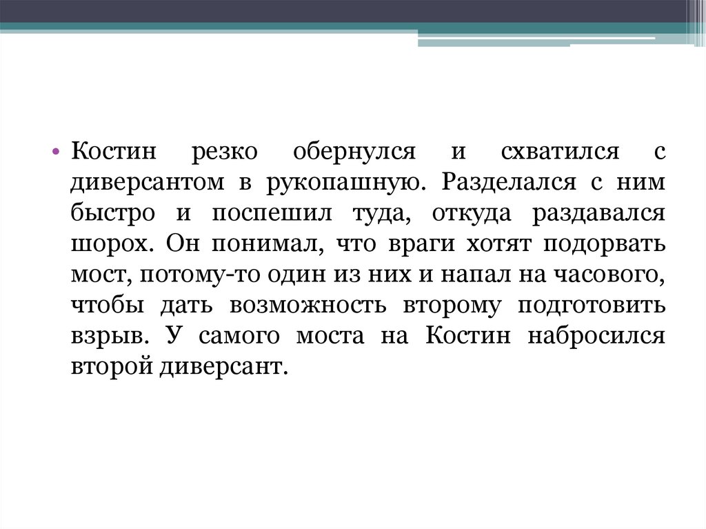 • Костин резко обернулся и схватился сдиверсантом в рукопашную. Разделался с ним