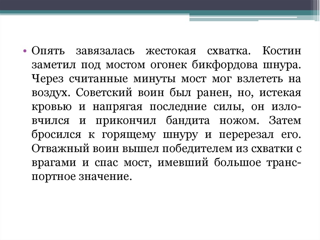 • Опять завязалась жестокая схватка. Костинзаметил под мостом огонек бикфордова шнура.