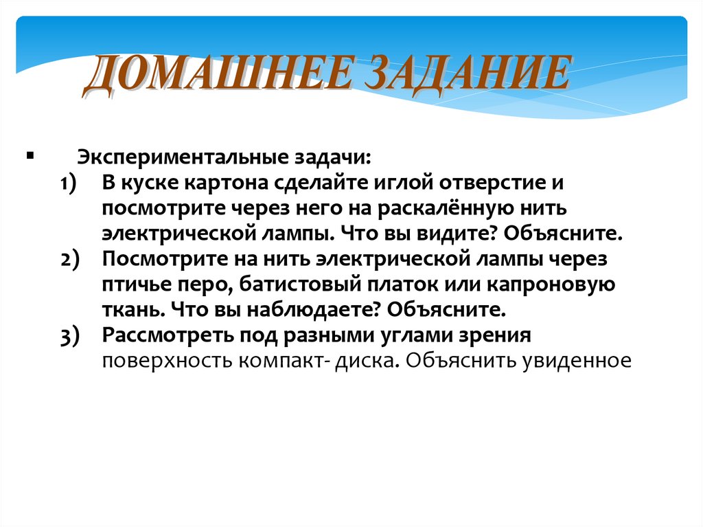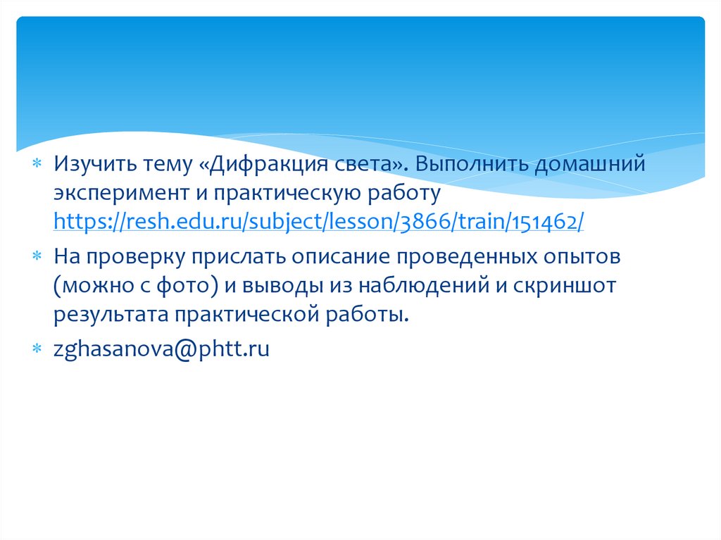 Изучить тему «Дифракция света». Выполнить домашнийэксперимент и практическую работу