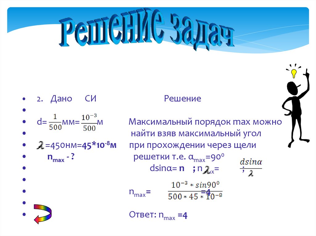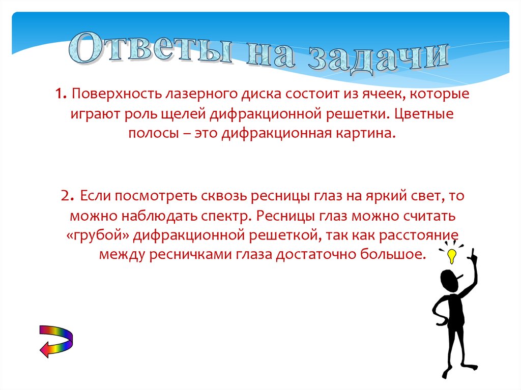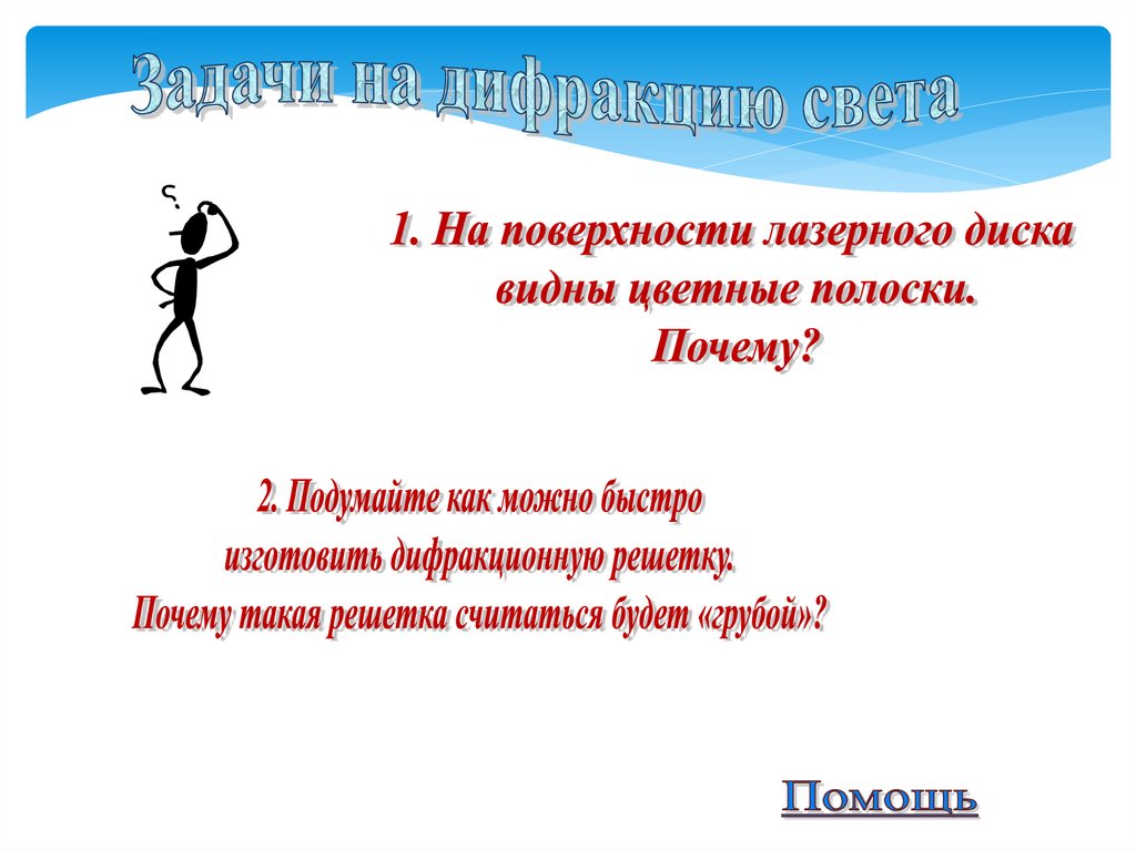 1. Поверхность лазерного диска состоит из ячеек, которыеиграют роль щелей дифракционной решетки. Цветные