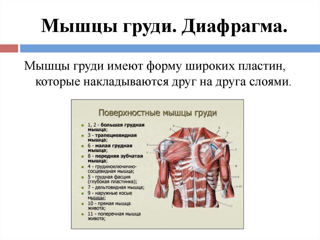 Мышцы груди. Диафрагма.Мышцы груди имеют форму широких пластин,