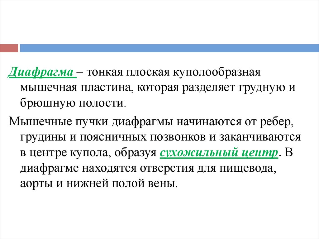 Диафрагма – тонкая плоская куполообразнаямышечная пластина, которая разделяет грудную и