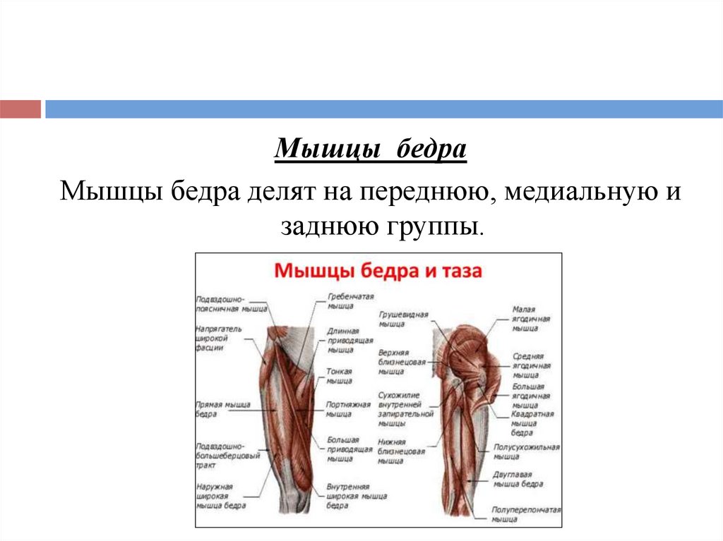 Мышцы бедраМышцы бедра делят на переднюю, медиальную и