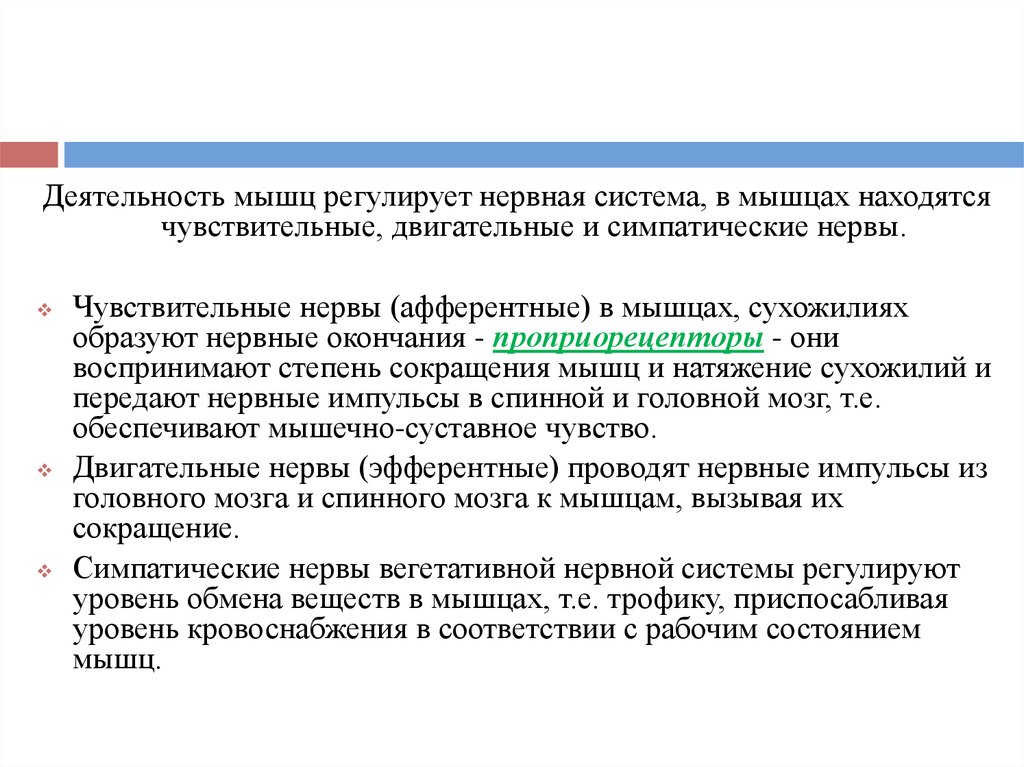 Деятельность мышц регулирует нервная система, в мышцах находятсячувствительные, двигательные и симпатические нервы.