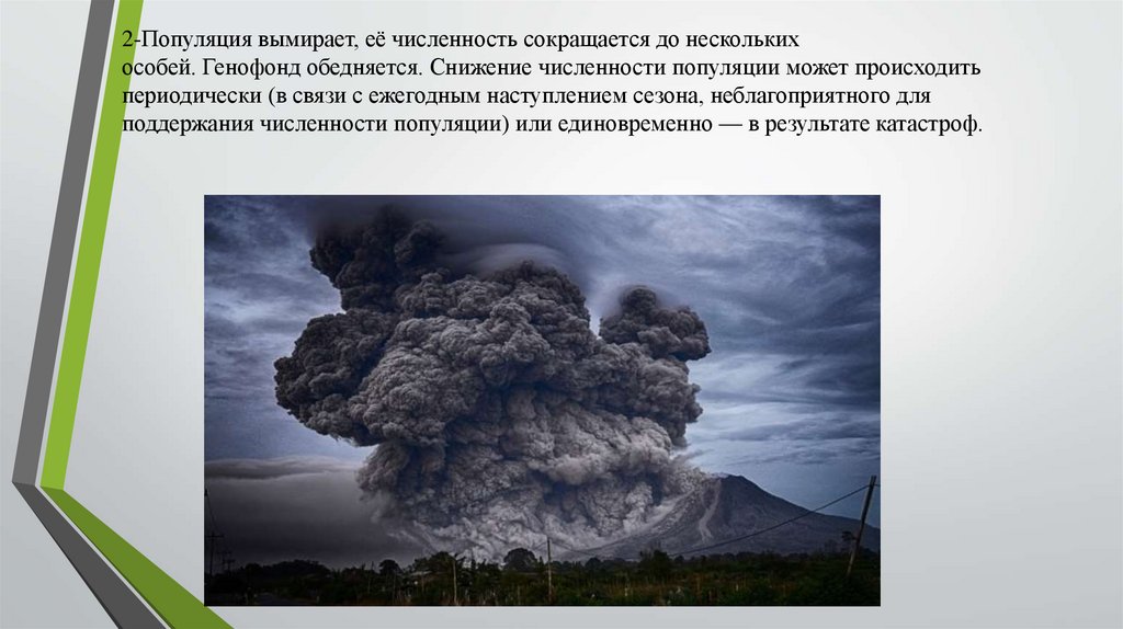 2-Популяция вымирает, её численность сокращается до несколькихособей. Генофонд обедняется. Снижение численности популяции может происходить