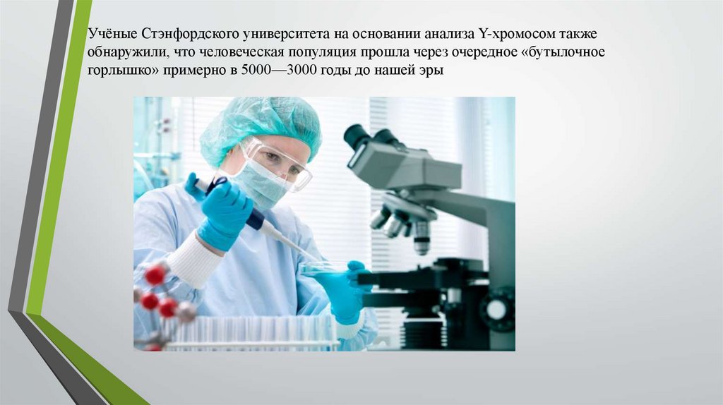 Учёные Стэнфордского университета на основании анализа Y-хромосом такжеобнаружили, что человеческая популяция прошла через очередное «бутылочное