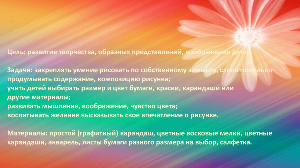 Цель: развитие творчества, образных представлений, воображения детей.Задачи: закреплять умение рисовать по собственному замыслу, самостоятельно