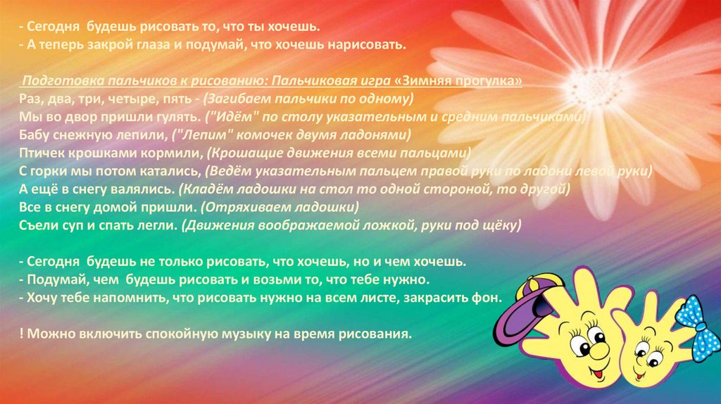 - Сегодня будешь рисовать то, что ты хочешь.- А теперь закрой глаза и подумай, что хочешь нарисовать.