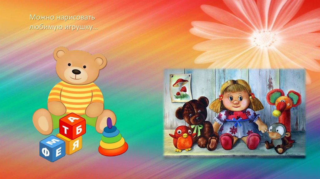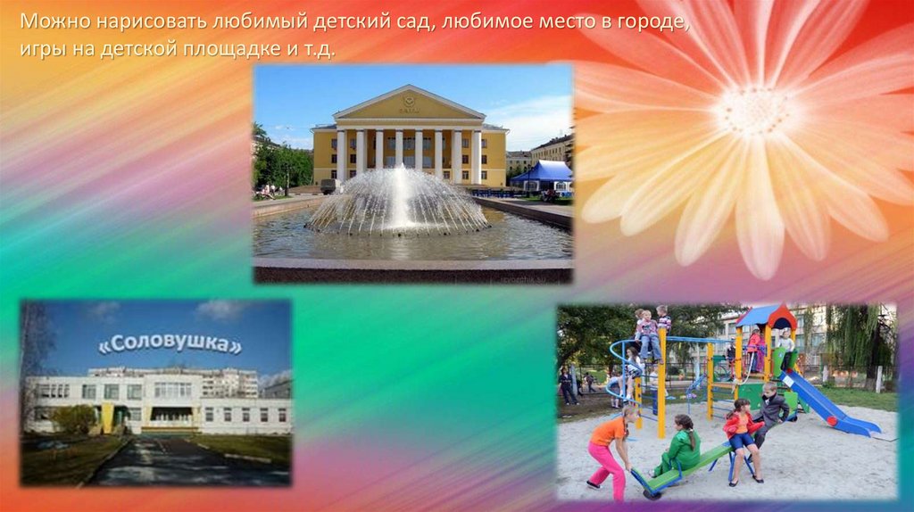 Можно нарисовать любимый детский сад, любимое место в городе,игры на детской площадке и т.д.
