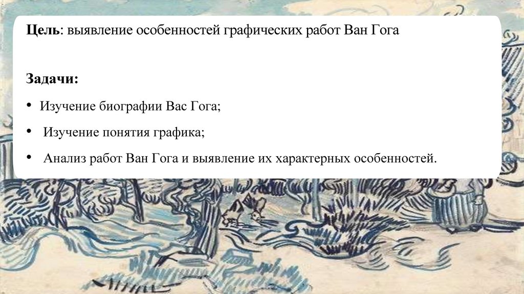 Цель: выявление особенностей графических работ Ван ГогаЗадачи: