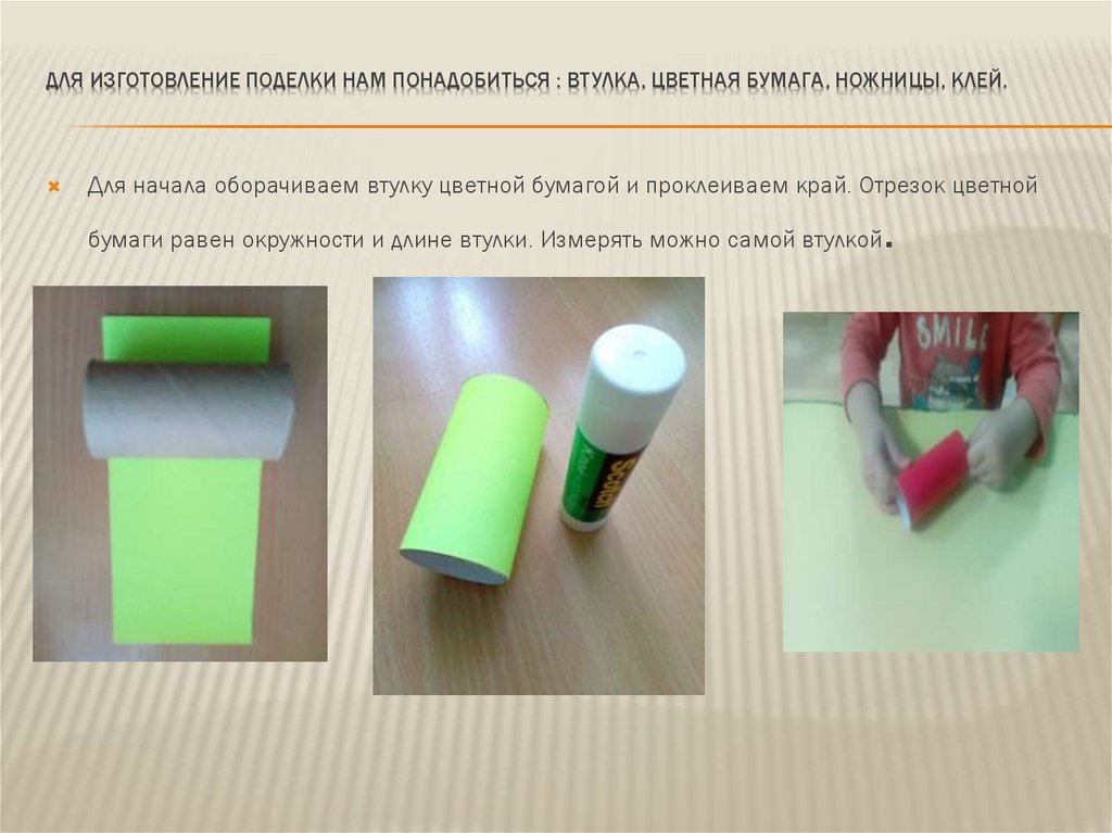 ДЛЯ ИЗГОТОВЛЕНИЕ ПОДЕЛКИ НАМ ПОНАДОБИТЬСЯ : ВТУЛКА, ЦВЕТНАЯ БУМАГА, НОЖНИЦЫ, КЛЕЙ.Для начала оборачиваем втулку цветной бумагой и проклеиваем край. Отрезок цветной