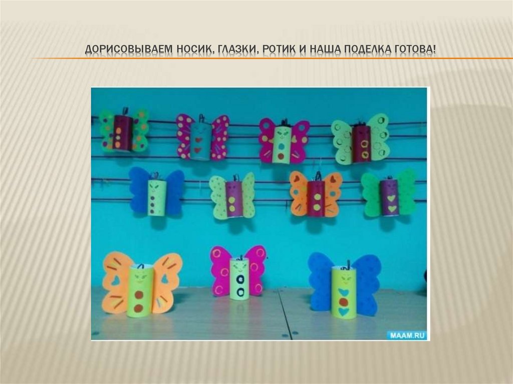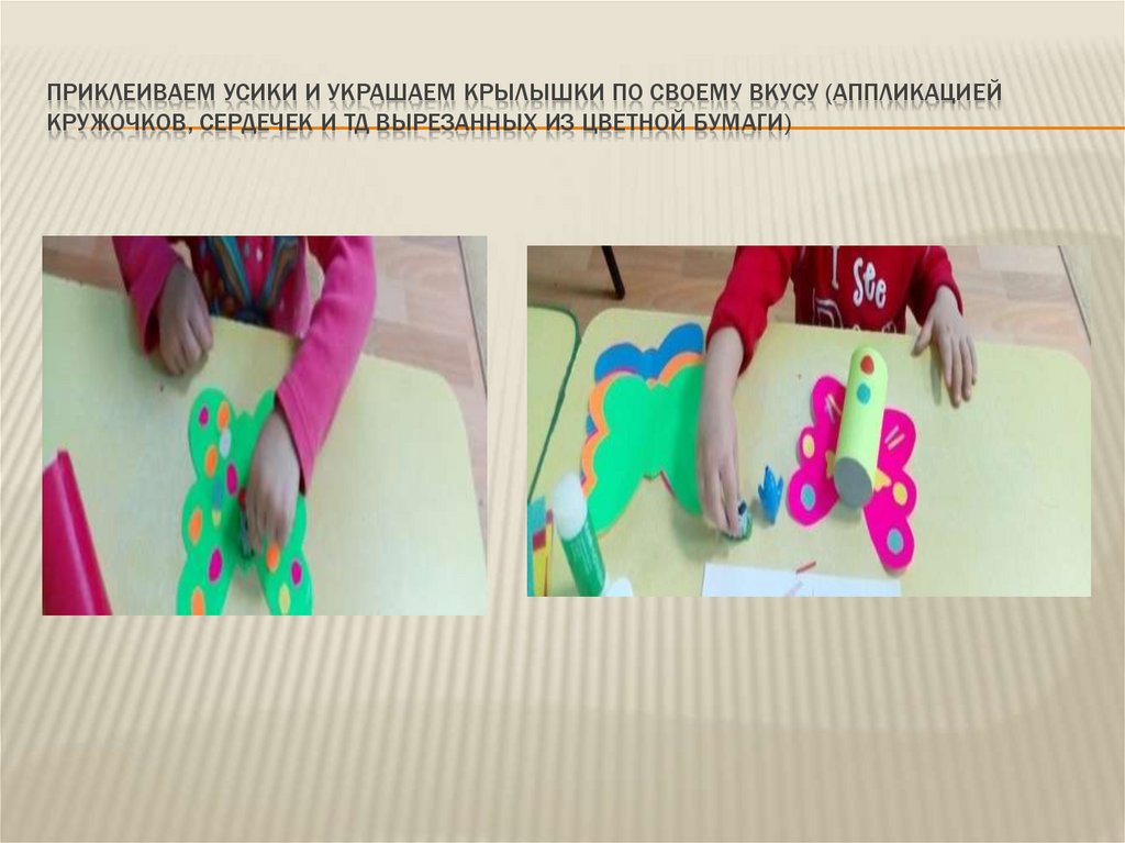ПРИКЛЕИВАЕМ УСИКИ И УКРАШАЕМ КРЫЛЫШКИ ПО СВОЕМУ ВКУСУ (АППЛИКАЦИЕЙКРУЖОЧКОВ, СЕРДЕЧЕК И ТД ВЫРЕЗАННЫХ ИЗ ЦВЕТНОЙ БУМАГИ)