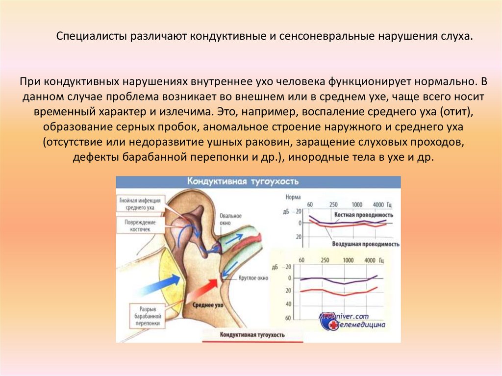 Специалисты различают кондуктивные и сенсоневральные нарушения слуха.При кондуктивных нарушениях внутреннее ухо человека функционирует нормально. В