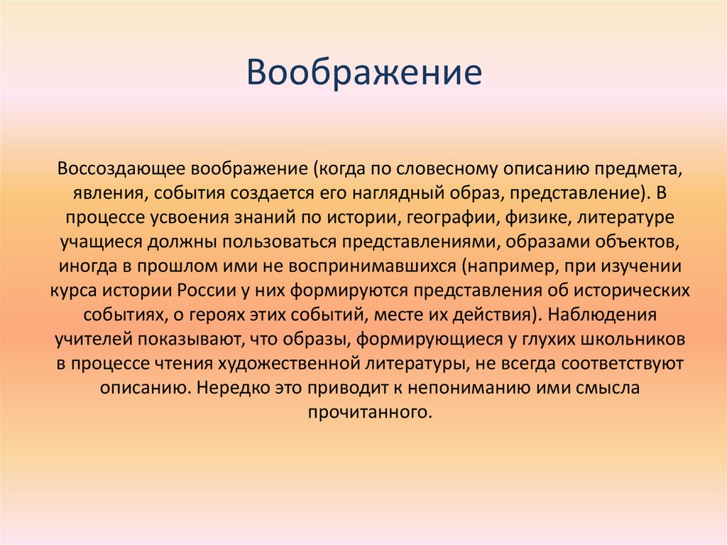 ВоображениеВоссоздающее воображение (когда по словесному описанию предмета,