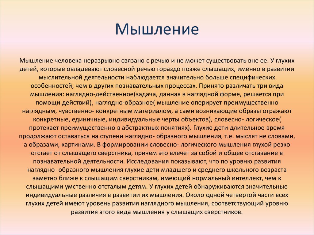 протекает преимущественно в абстрактных понятиях). Глухие дети длительное время