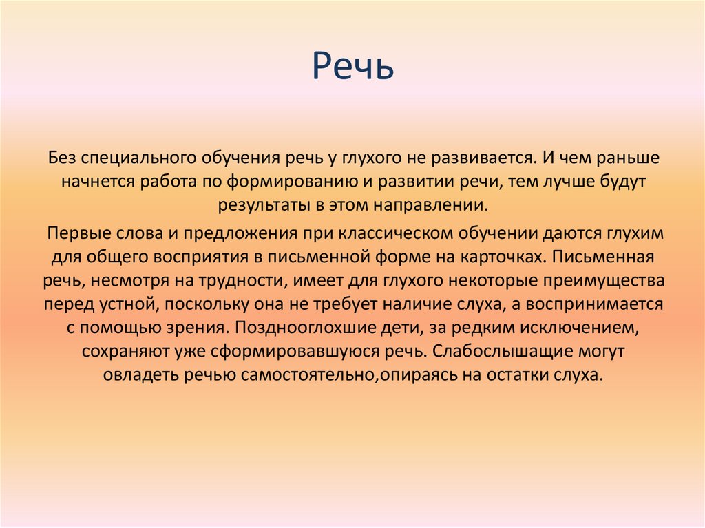 РечьБез специального обучения речь у глухого не развивается. И чем раньше