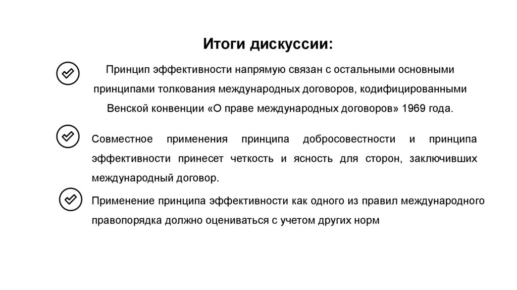 Итоги дискуссии:Принцип эффективности напрямую связан с остальными основными