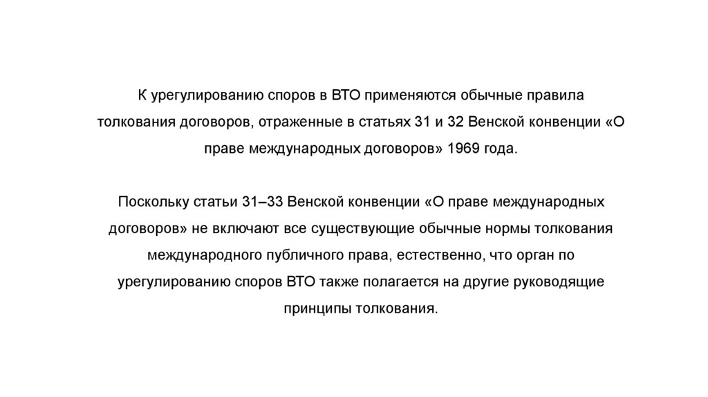 К урегулированию споров в ВТО применяются обычные правилатолкования договоров, отраженные в статьях 31 и 32 Венской конвенции «О