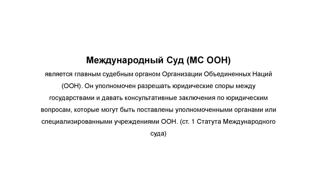 Международный Суд (МС ООН)является главным судебным органом Организации Объединенных Наций