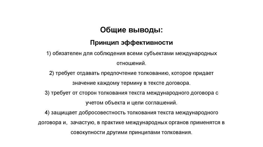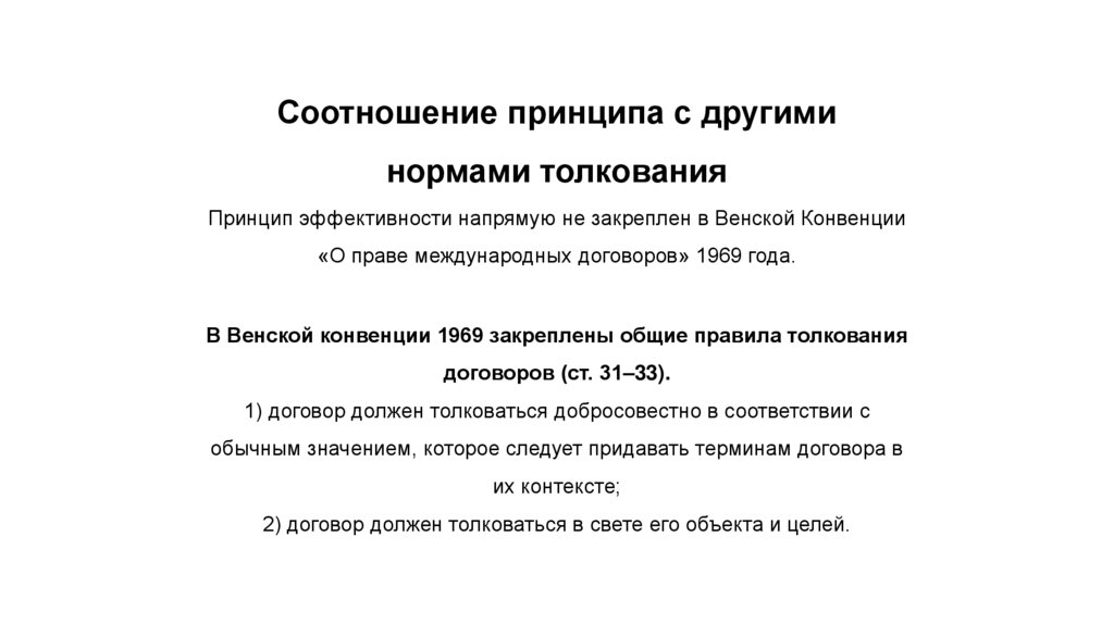 Существует несколько принципов толкования международных договоров,одним из которых выступает принцип эффективной интерпретации.
