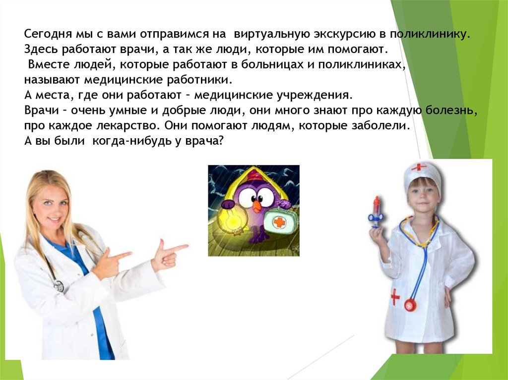 Сегодня мы с вами отправимся на виртуальную экскурсию в поликлинику.Здесь работают врачи, а так же люди, которые им помогают.
