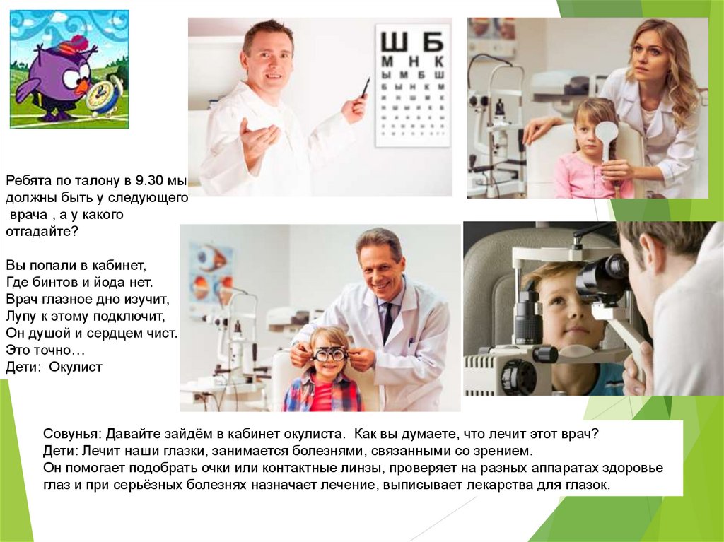 Дети: Лечит наши глазки, занимается болезнями, связанными со зрением.