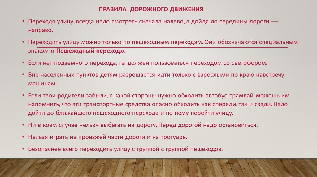 ПРАВИЛА ДОРОЖНОГО ДВИЖЕНИЯ• Переходя улицу, всегда надо смотреть сначала налево, а дойдя до середины дороги —