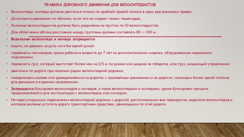 ПРАВИЛА ДОРОЖНОГО ДВИЖЕНИЯ ДЛЯ ВЕЛОСИПЕДИСТОВ• Велосипеды, мопеды должны двигаться только по крайней правой полосе в один ряд возможно правее.