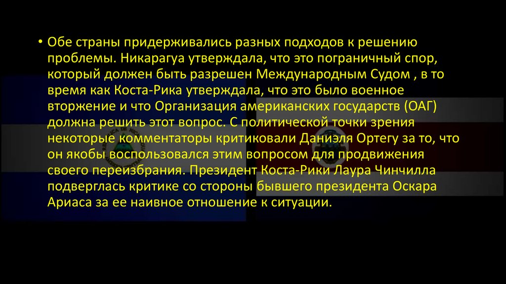 • Обе страны придерживались разных подходов к решениюпроблемы. Никарагуа утверждала, что это пограничный спор,