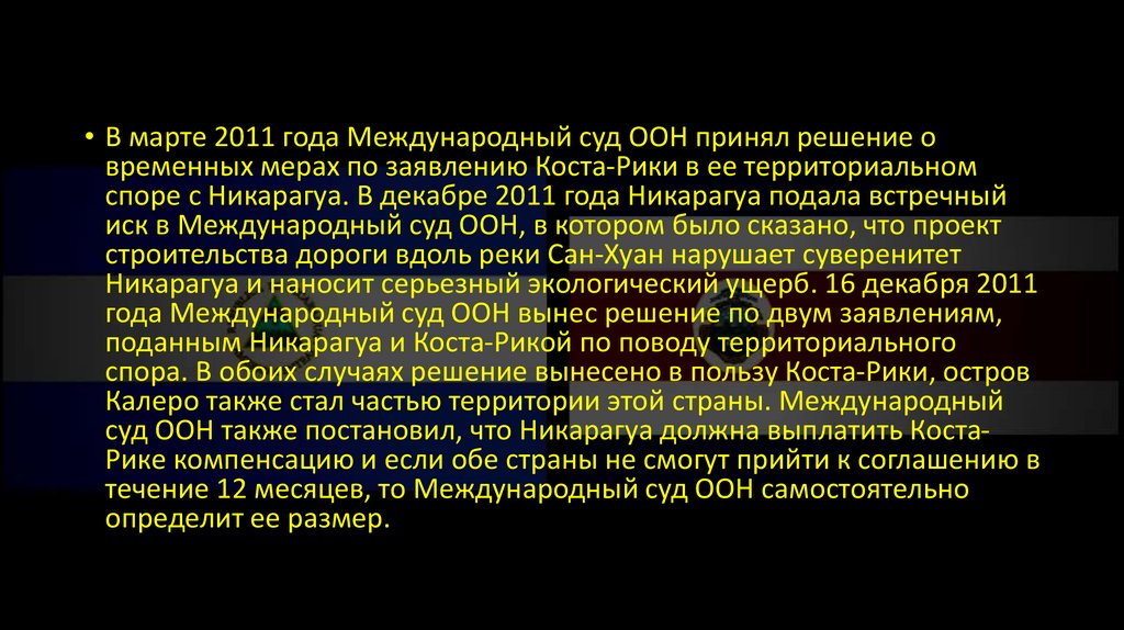 • В марте 2011 года Международный суд ООН принял решение овременных мерах по заявлению Коста-Рики в ее территориальном