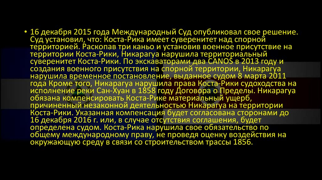 • 16 декабря 2015 года Международный Суд опубликовал свое решение.Суд установил, что: Коста-Рика имеет суверенитет над спорной