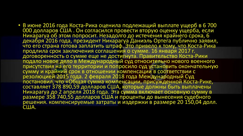 • В июне 2016 года Коста-Рика оценила подлежащий выплате ущерб в 6 700000 долларов США . Он согласился провести вторую оценку ущерба, если