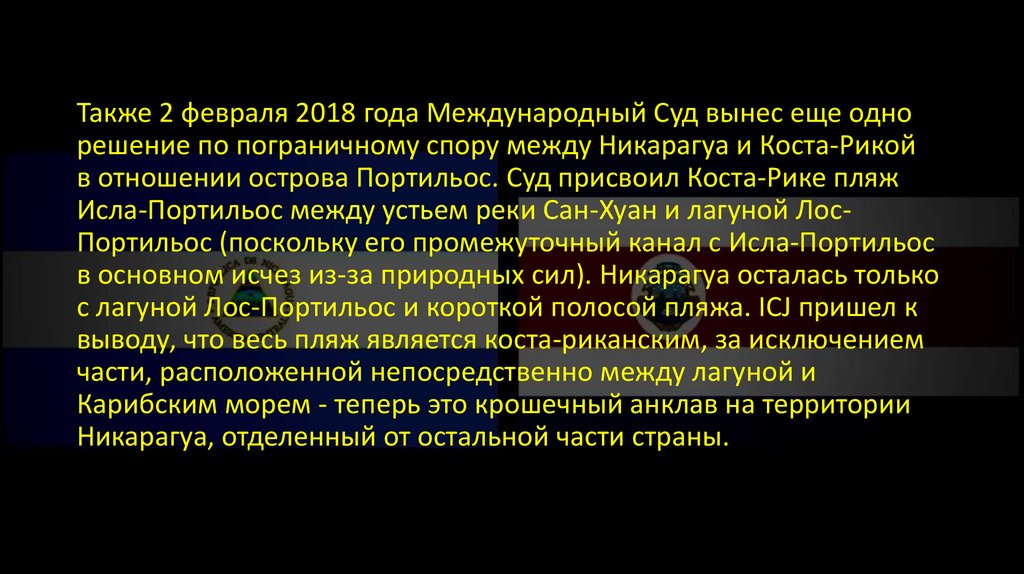 Также 2 февраля 2018 года Международный Суд вынес еще однорешение по пограничному спору между Никарагуа и Коста-Рикой