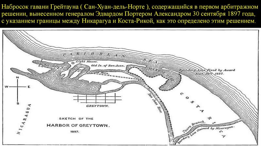 Набросок гавани Грейтауна ( Сан-Хуан-дель-Норте ), содержащийся в первом арбитражномрешении, вынесенном генералом Эдвардом Портером Александром 30 сентября 1897 года,