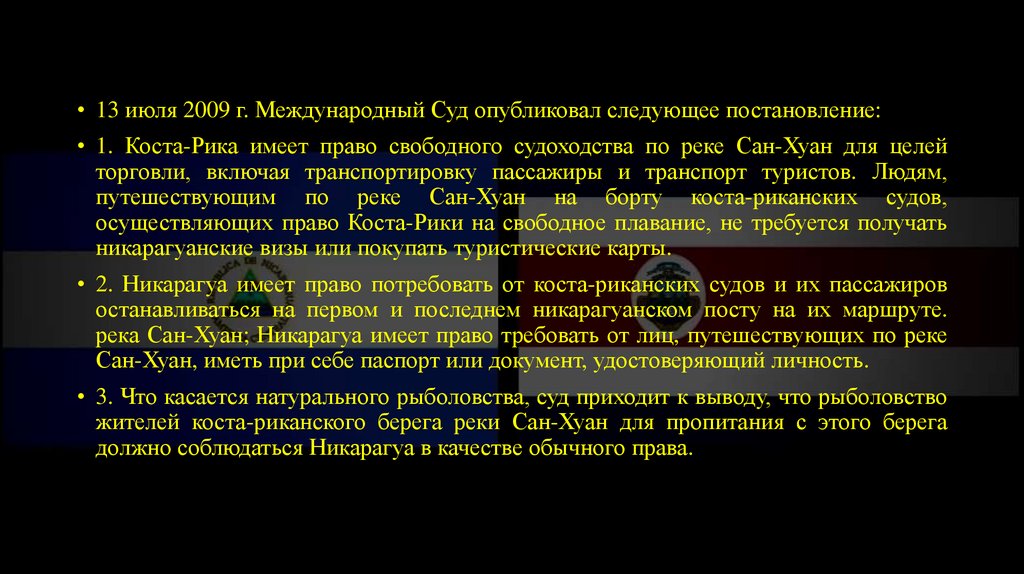 • 13 июля 2009 г. Международный Суд опубликовал следующее постановление:• 1. Коста-Рика имеет право свободного судоходства по реке Сан-Хуан для целей