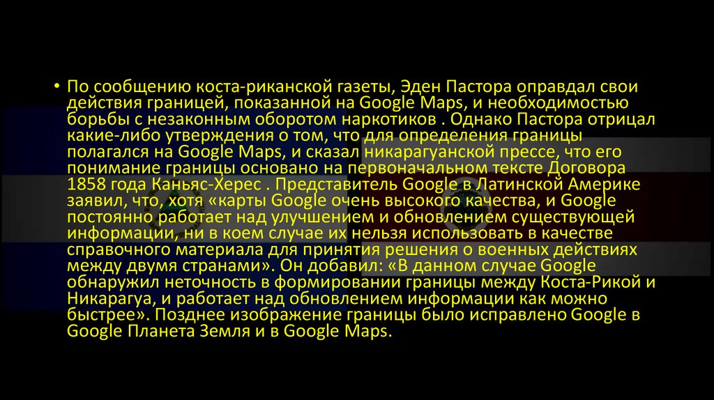 • По сообщению коста-риканской газеты, Эден Пастора оправдал своидействия границей, показанной на Google Maps, и необходимостью