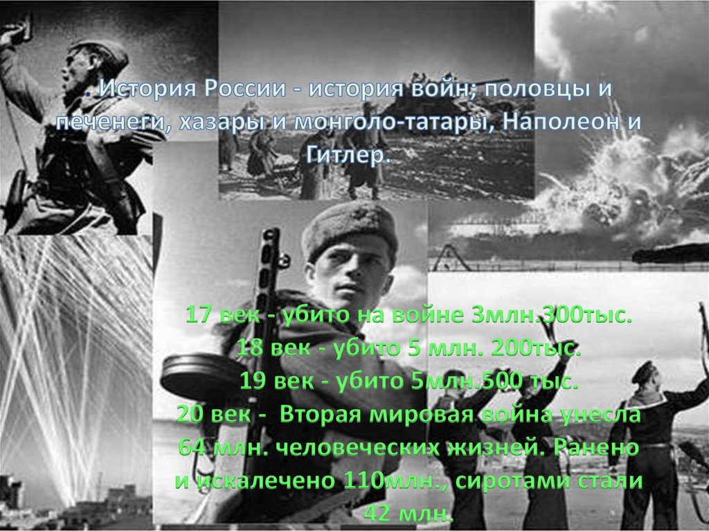 17 век - убито на войне 3млн.300тыс.18 век - убито 5 млн. 200тыс.