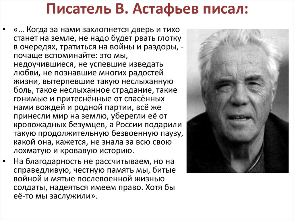 Писатель В. Астафьев писал:• «… Когда за нами захлопнется дверь и тихо