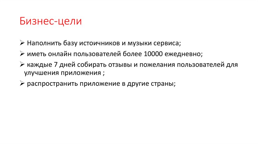 Бизнес-целиНаполнить базу истоичников и музыки сервиса;