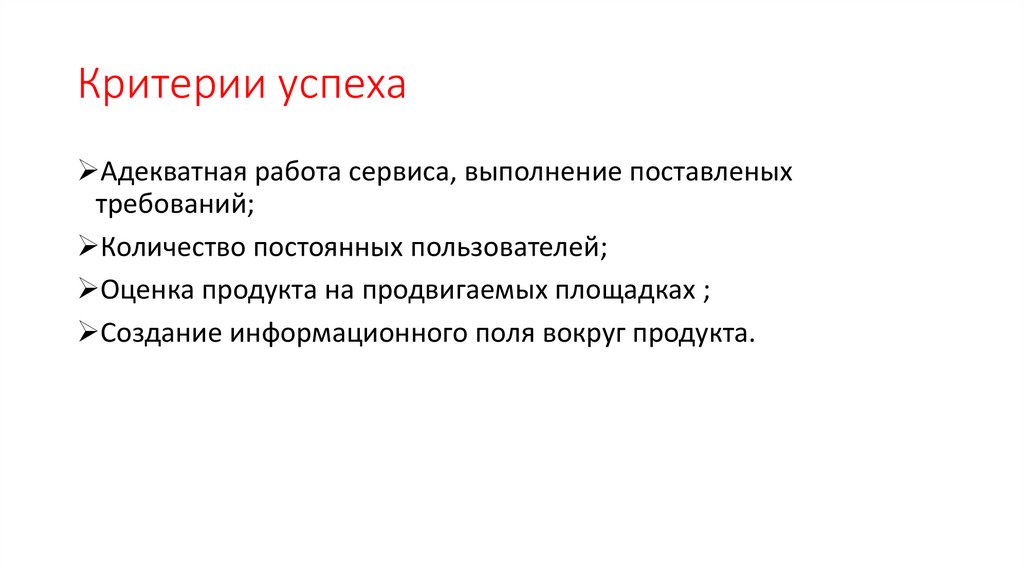 Критерии успехаАдекватная работа сервиса, выполнение поставленых