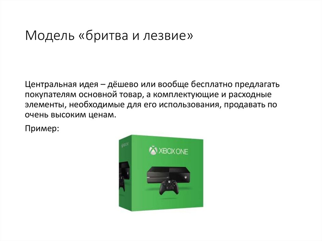 Модель «бритва и лезвие»Центральная идея – дёшево или вообще бесплатно предлагать